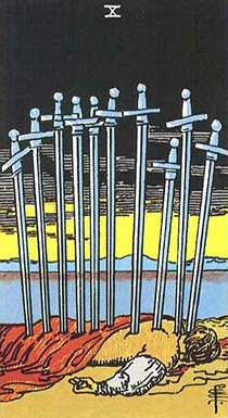 About twelve years ago, when I was smack-dab in the middle of a divorce from my first husband, I went to a party/talent show at a small bar on the edge of downtown Edmonton. I didn't know many people and I was shy, but also determined to have a good time because I'd found childcare and escaped, for a few hours, the overwhelming complexity and sadness of my life at that time. There was a Tarot reader there, an effeminate man with a strong voice. My reading made him uncomfortable. It was all swords. Ten of swords. I still remember how perfectly the image represented my situation. I bought my first tarot deck the next day.